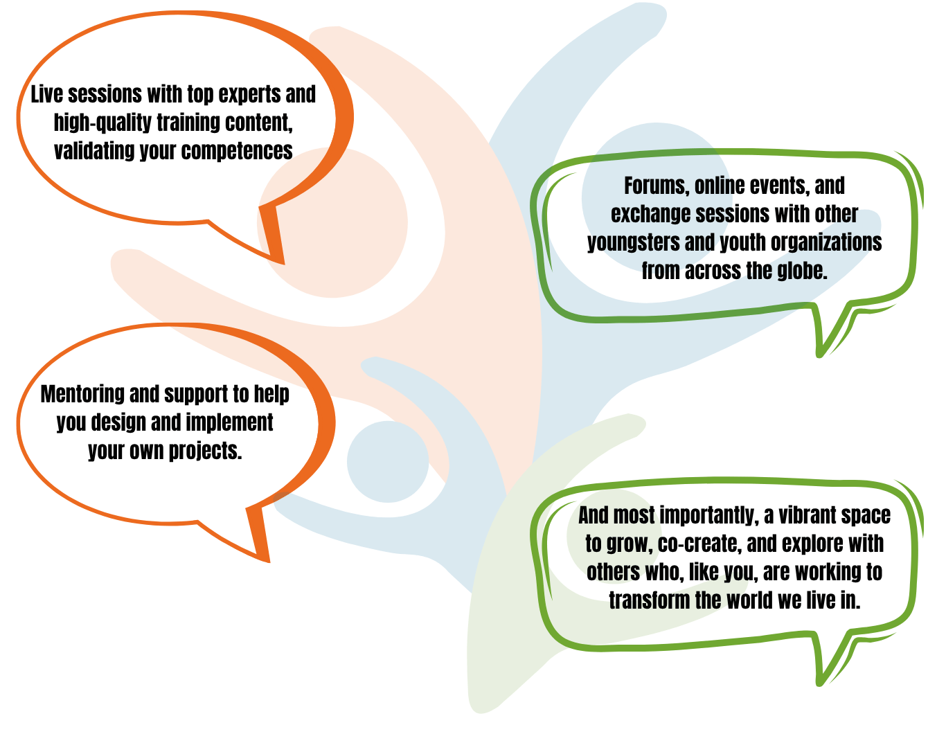 - Forums, online events, and exchange sessions with other youngsters and youth organizations from across the globe.